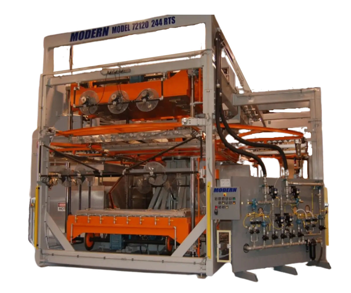 Modern Machinery designed and manufactured, multi-station, rotary-motion twin sheet thermoformer. A horizontally clockwise rotating wheel indexes the cut-to-size sheets through the load/unload, pre-heat, final heat and form stations. The MODERN machine is equipped with computer controls and all valving, permitting thermoforming cycles. The PLC control also allows the different techniques to be easily modified or new customer specific needs.